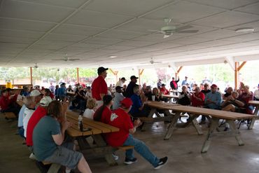 Drivers from the visiting corvette clubs were given a commemorative 11th anniversary hat pin. A free parking lot hotdog lunch was enjoyed. Residents of the Veteran's Home had their own cookout, also furnished by our sponsor. Before leaving IVH, the visiting clubs had a moment to take the stage and share a bit about their club.